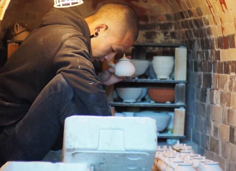 8年前、下城爽さんは東京藝術大学工芸科に入学し、陶芸専攻に進みました。当初から自然素材や技術的なことに対し独特な目線を持っていたように感じます。東京藝術大学の取手校地には登窯をはじめ様々な形式の薪窯があるなか、下城さんは卒業制作で原始人の如く穴を掘り進み、露わになってくる土を捏ねて形と成し、およそ陶芸窯とは言えないような深い穴で拾い集めた雑木を燃やすことを行いました。その後、大学院に進み築窯実習では取手の土のみで穴窯を築き、廃材や剪定した木材で焼成。ろくろ仕事の中でも最も繊細で複雑な急須作りに専念しています。このこだわりの行方は果たしてどこに向かうのかとても楽しみな存在です。